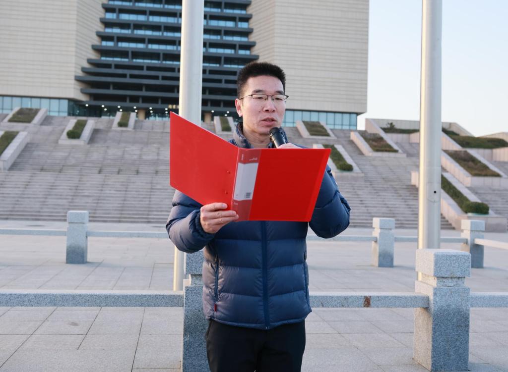 上午7时,全体师生庄严的注目礼下,国旗护卫队步伐铿锵,护送国旗入场。伴随着激昂的国歌声,五星红旗冉冉升起,全体师生齐声高唱国歌,爱国情怀在凛冽晨风中凝聚升腾。